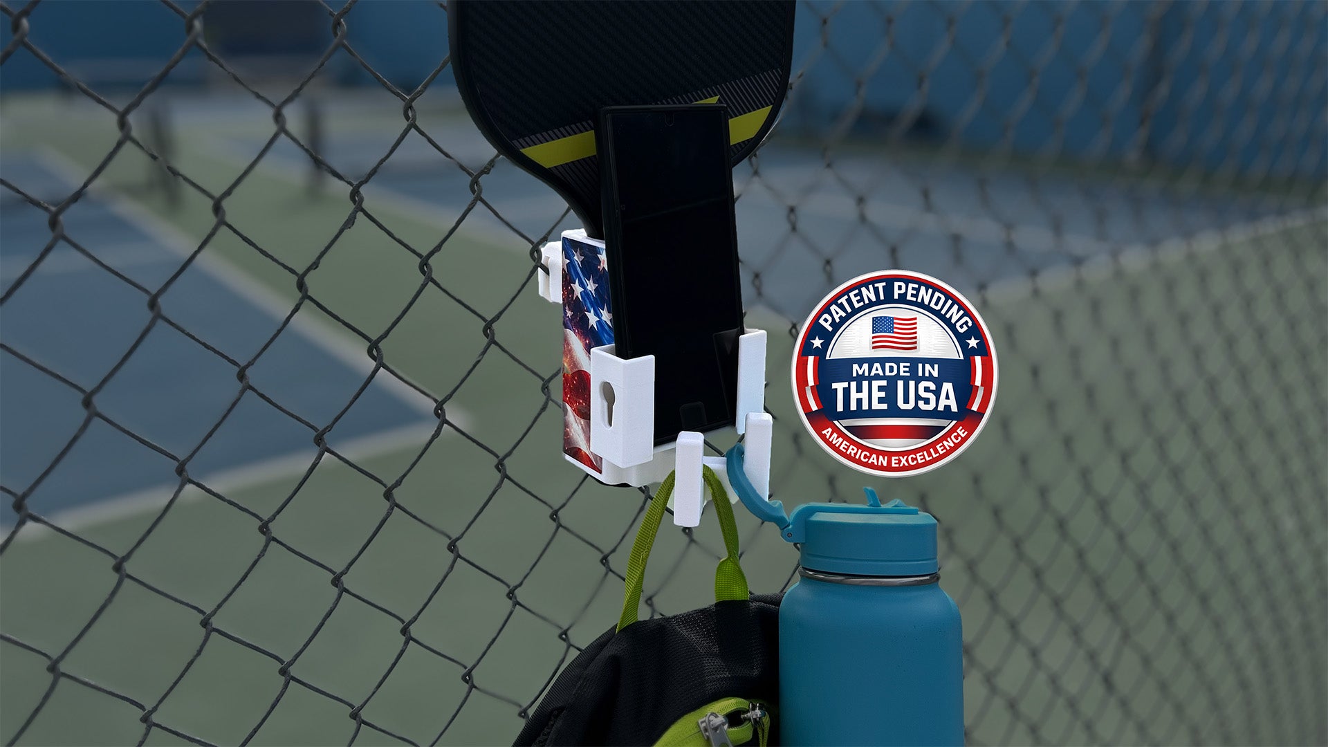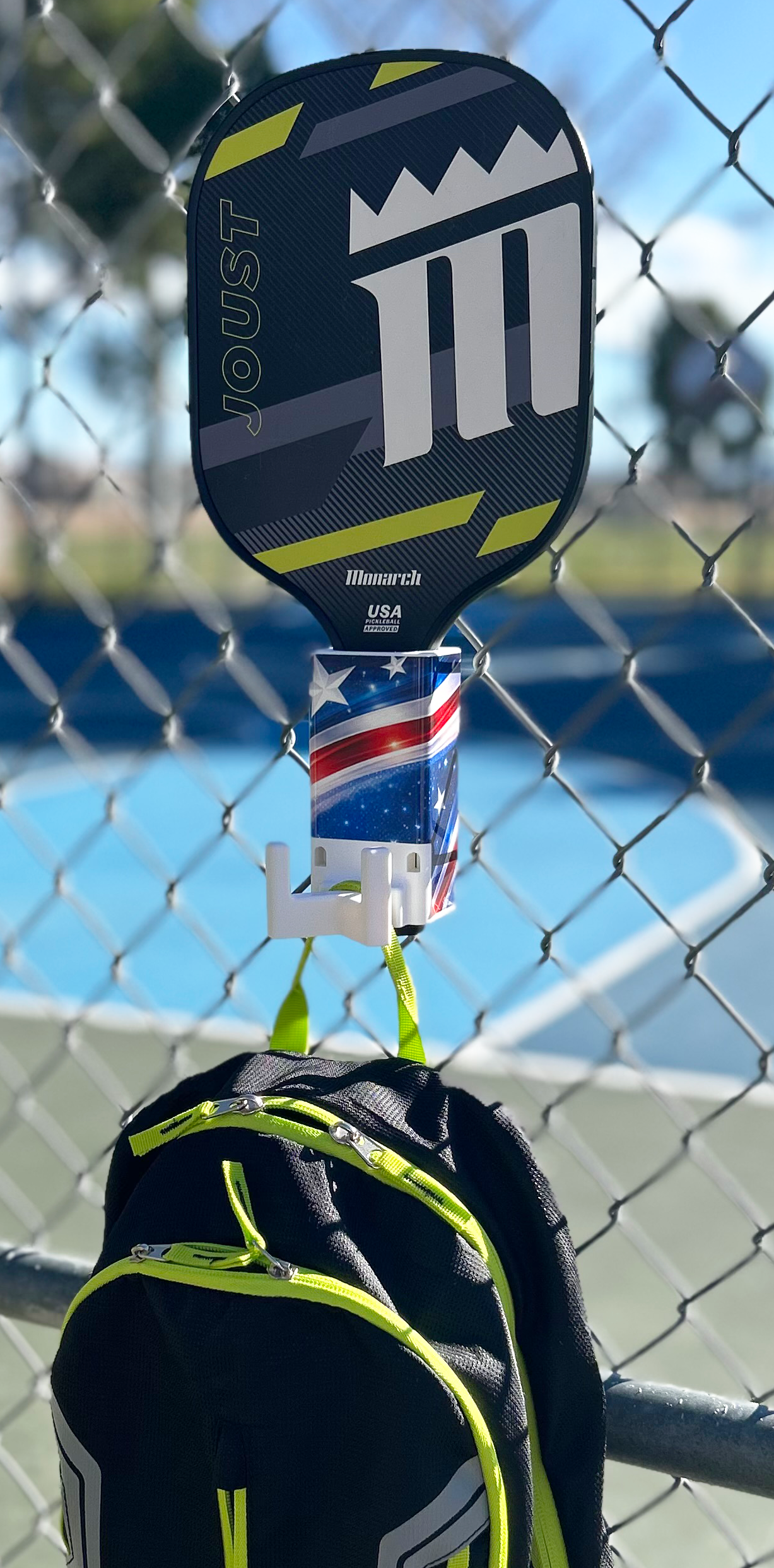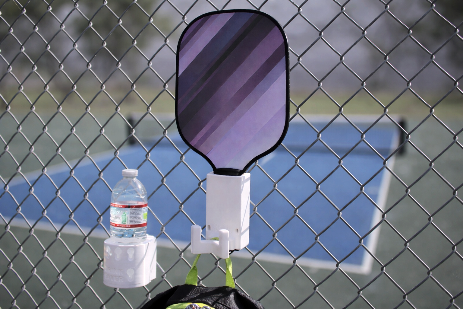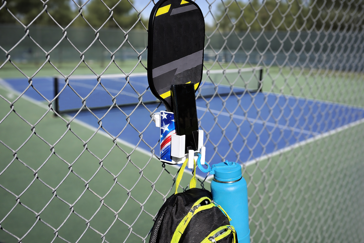 That led to the creation of The Paddle Saver™, a simple, durable caddy that mounts to 99% of chain-link fences. It keeps your Pickleball paddle and the rest of your gear protected, organized, and off that dirty ground.